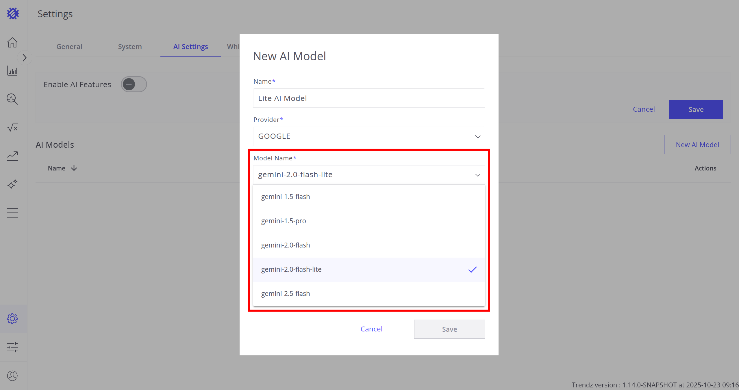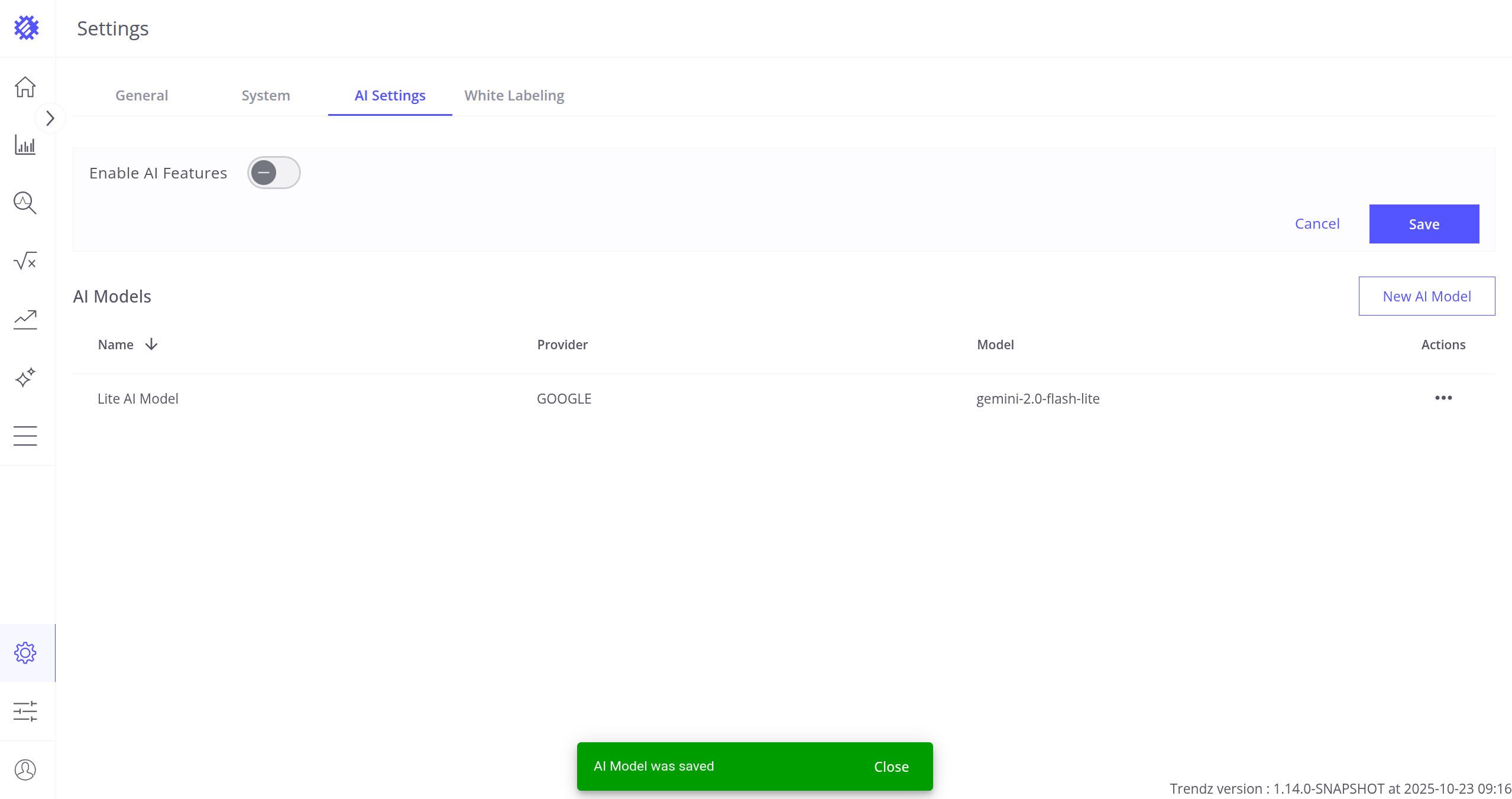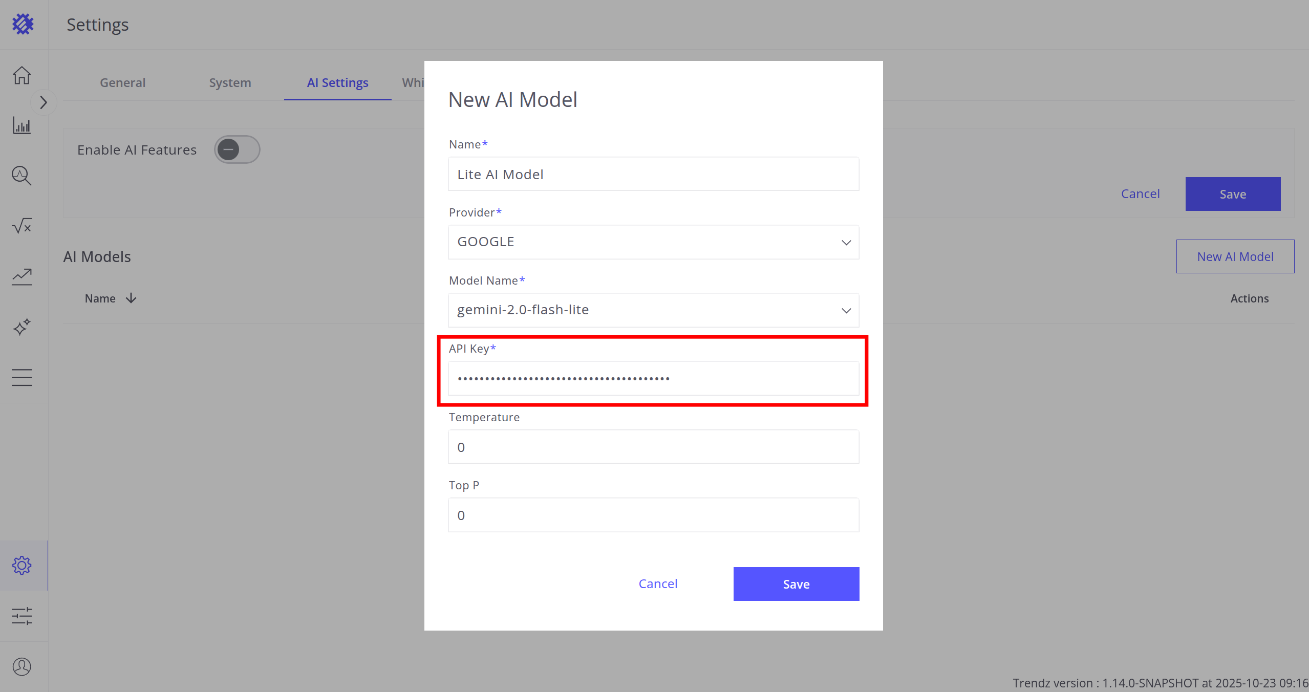 For cloud installations, Trendz provides a default AI model with a limited number of requests available. To extend this request limit or to enable additional AI features, you need to configure the AI Settings section.