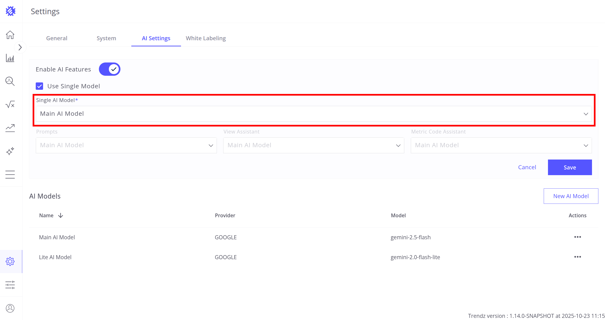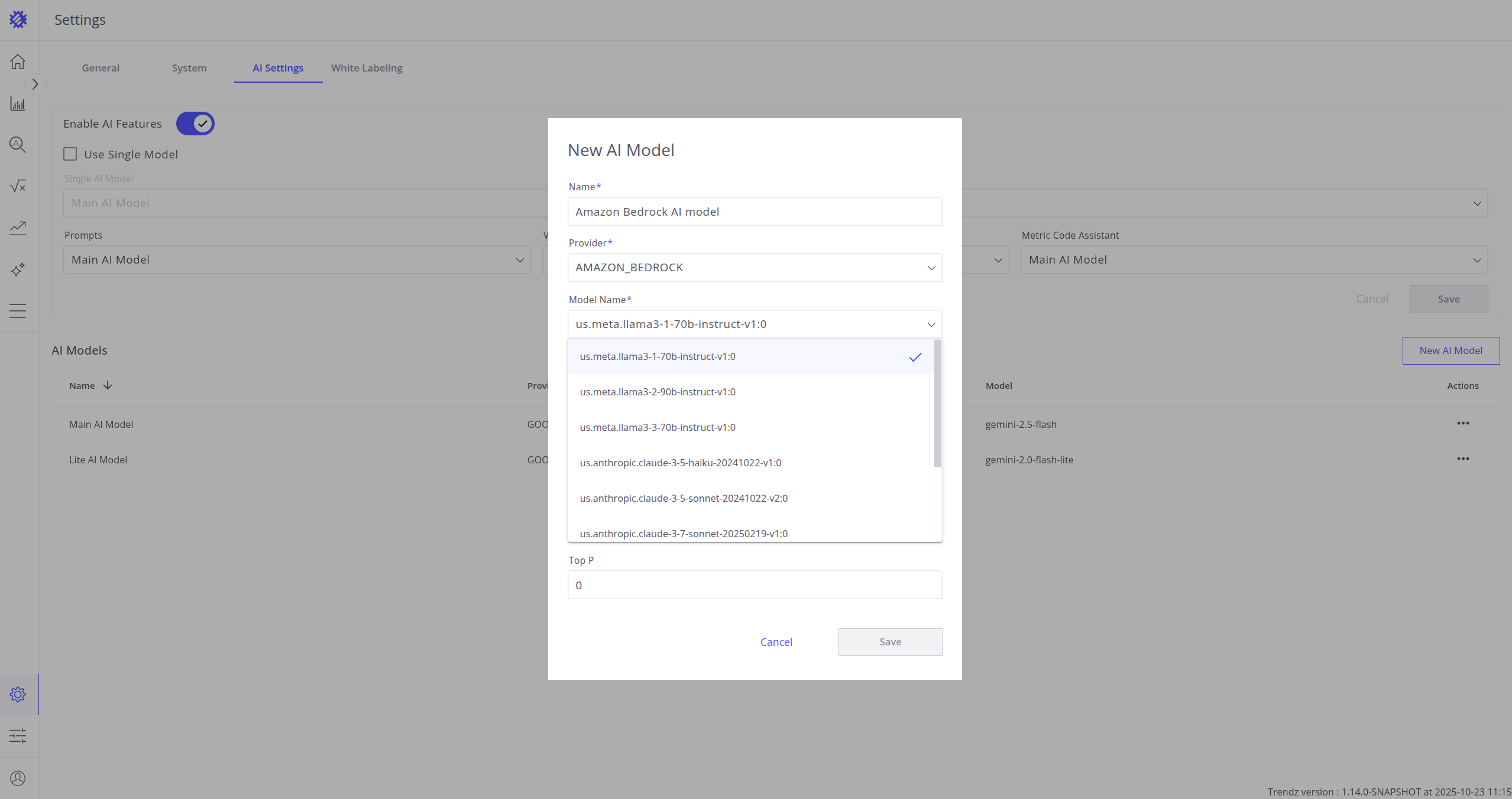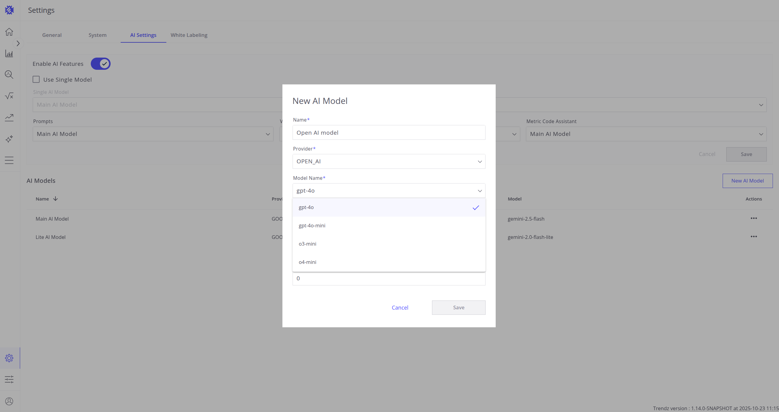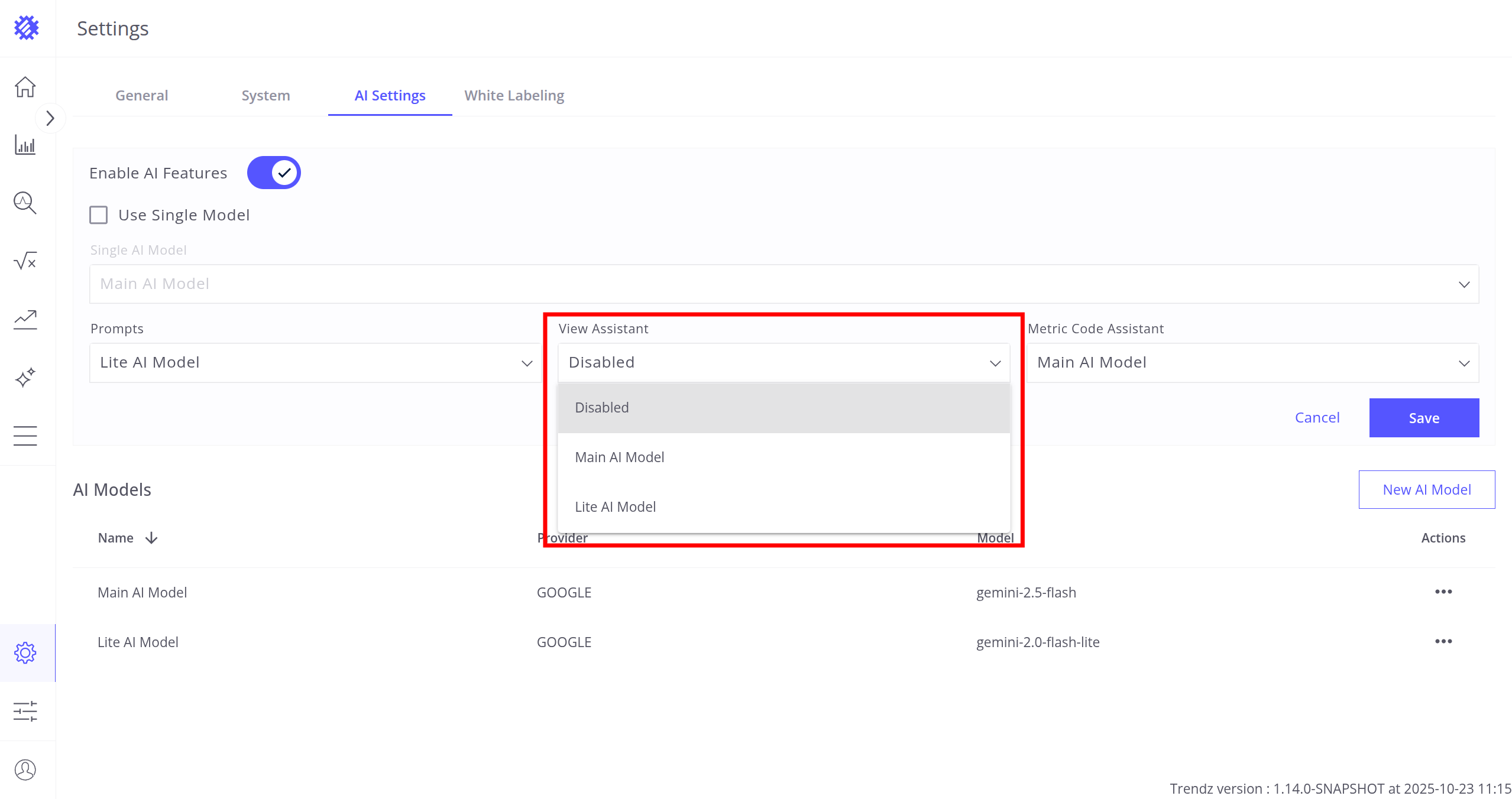 For cloud installations, Trendz provides a default AI model with a limited number of requests available. To extend this request limit or to enable additional AI features, you need to configure the AI Settings section.