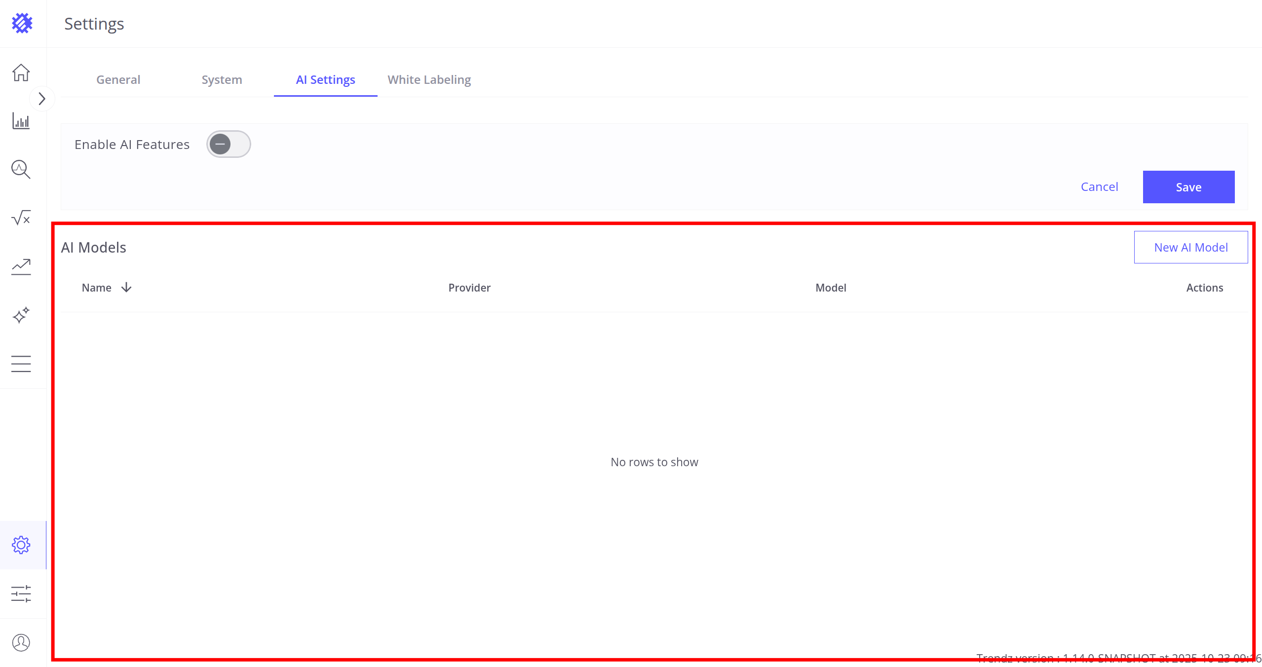 This section contains two parts: the AI Features section and the AI Models section. Before configuring the AI Features, you must add at least one AI Model.