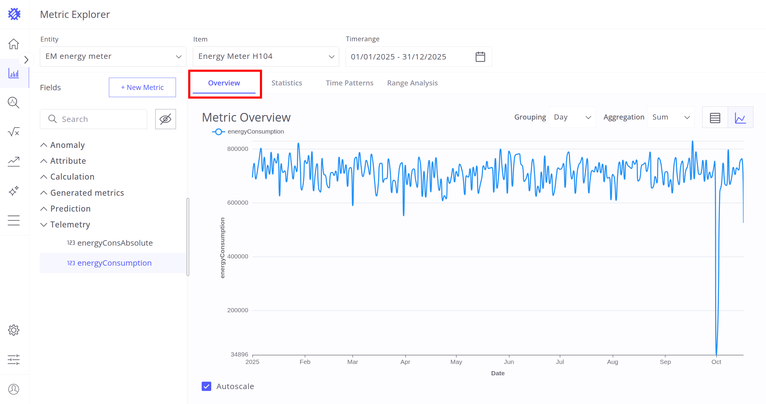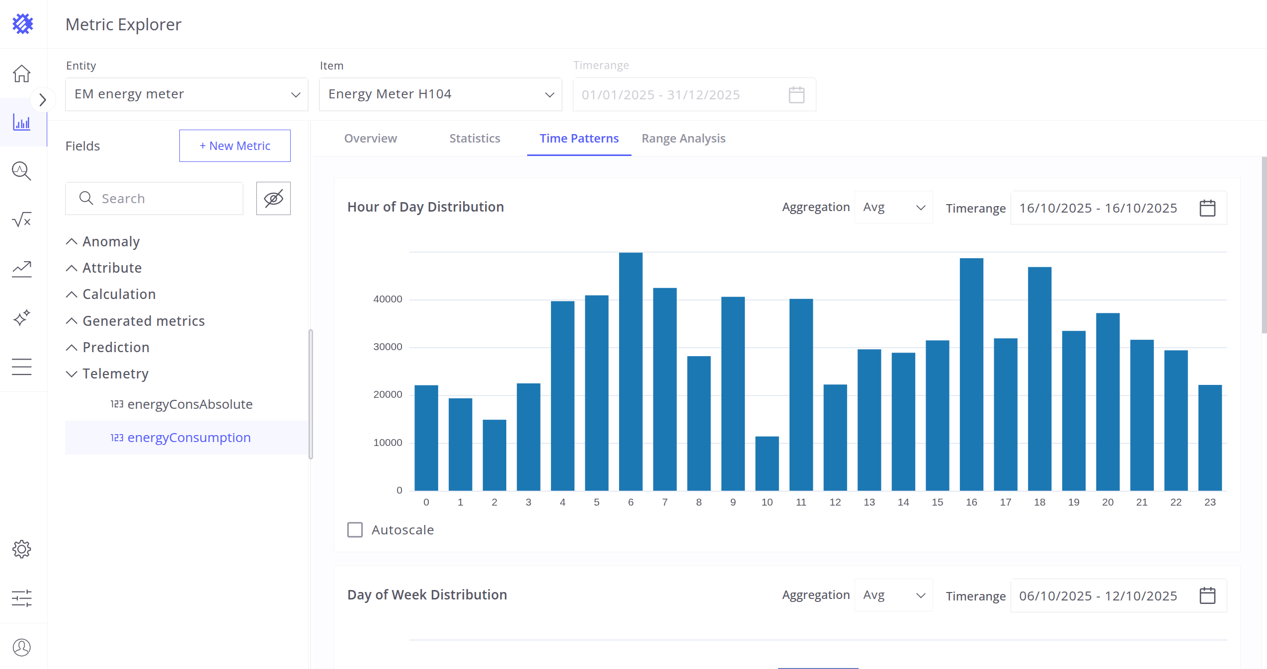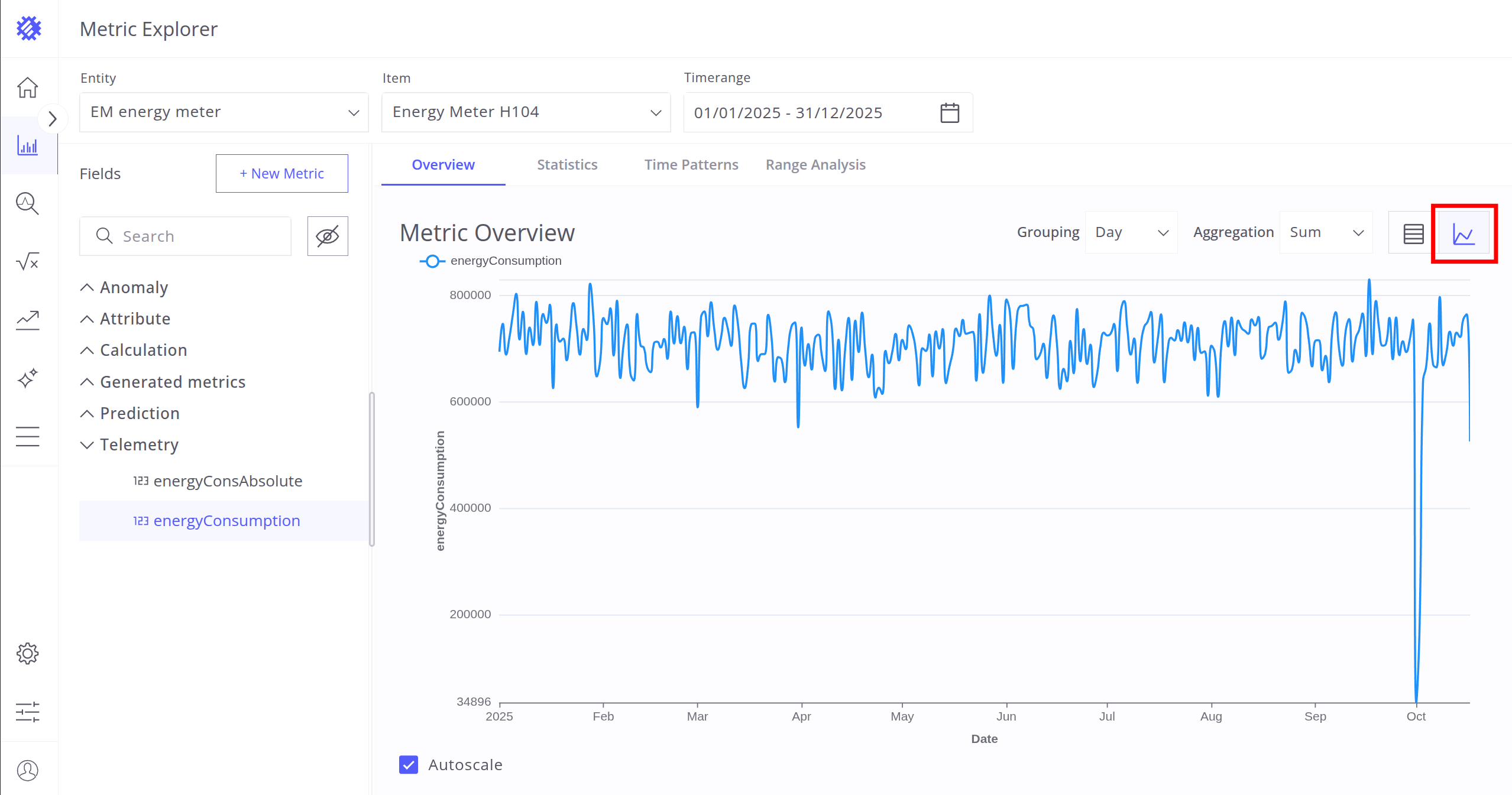 After selecting the entity, item, and timerange, choose a metric (telemetry or attribute) for analysis. Interaction with metrics is described in the next section.