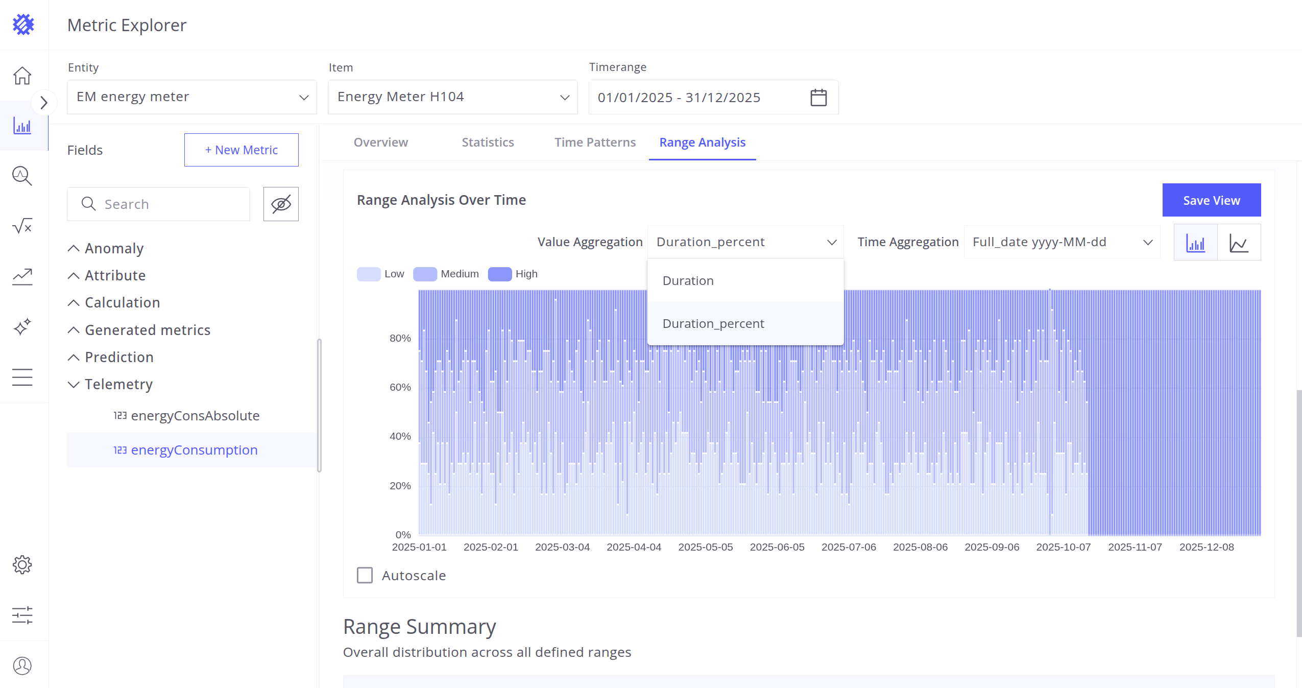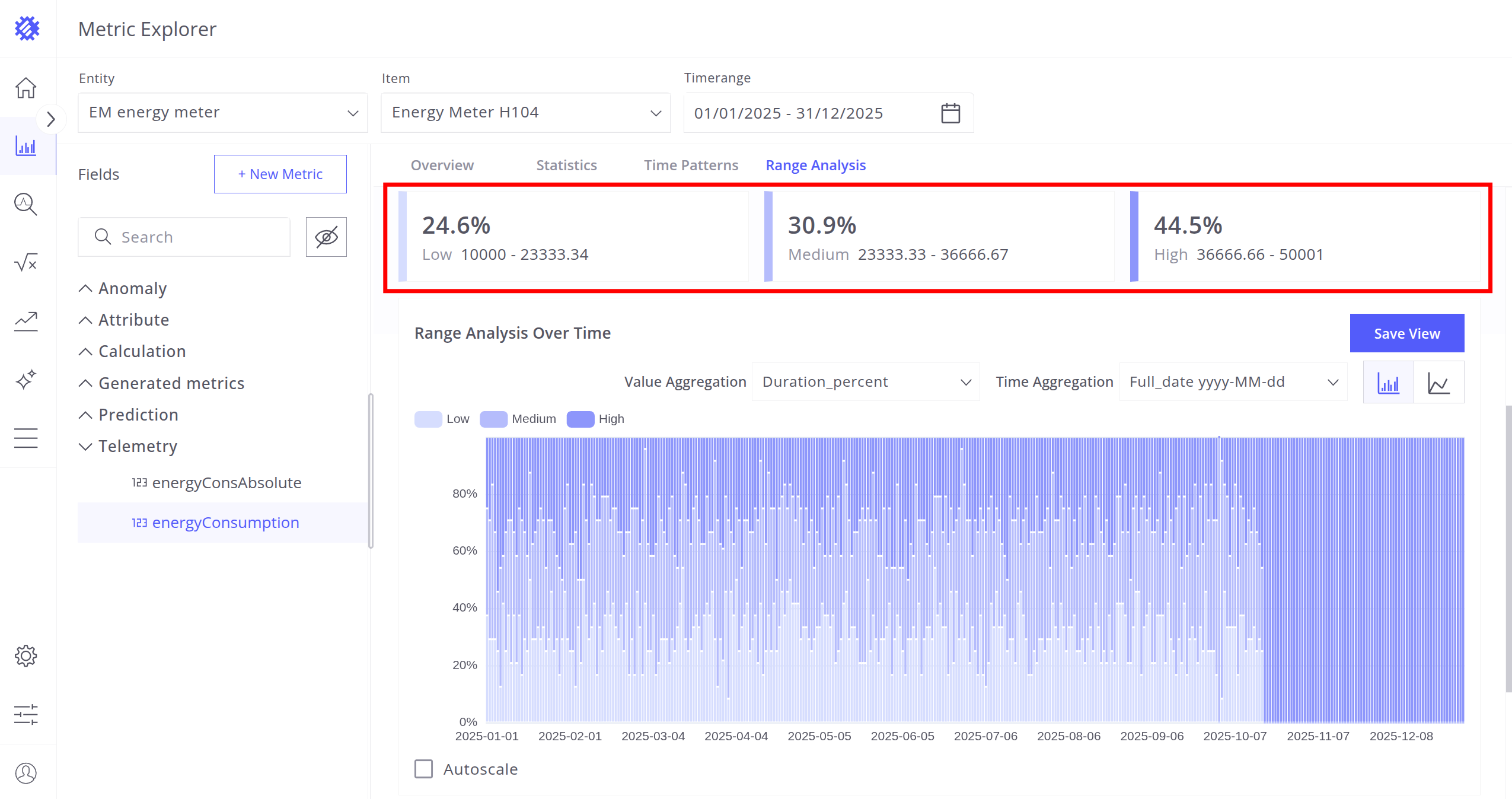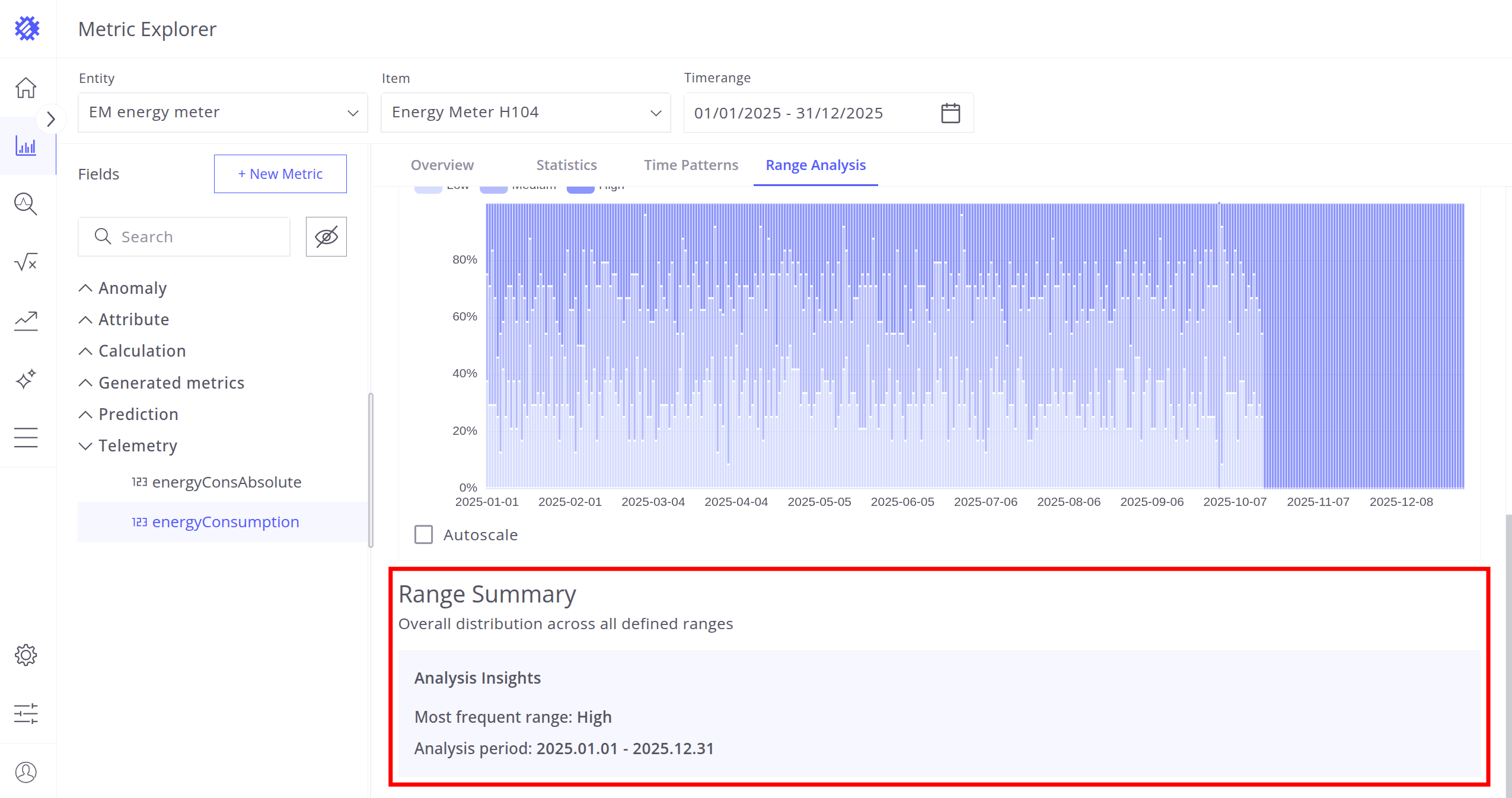 After selecting the entity, item, and timerange, choose a metric (telemetry or attribute) for analysis. Interaction with metrics is described in the next section.