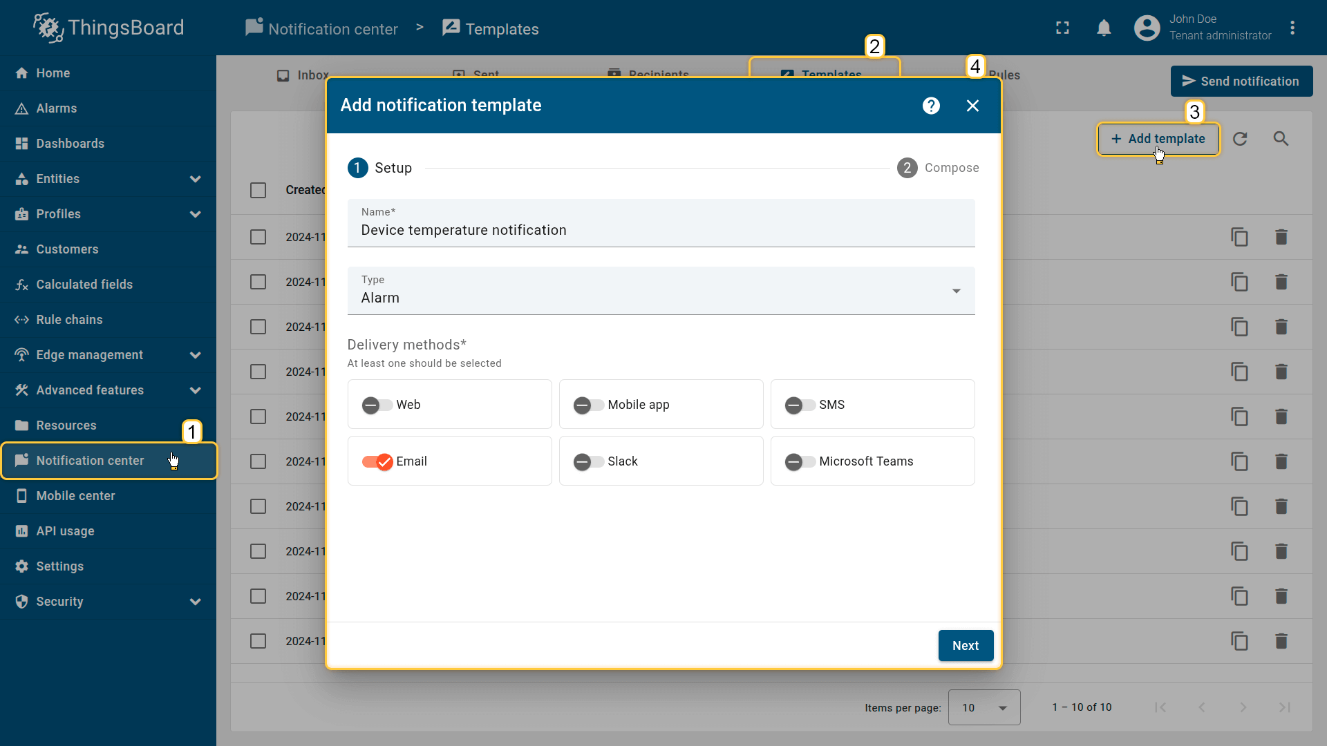 This guide explains how to configure ThingsBoard to automatically send email notifications to users when an alarm is created.