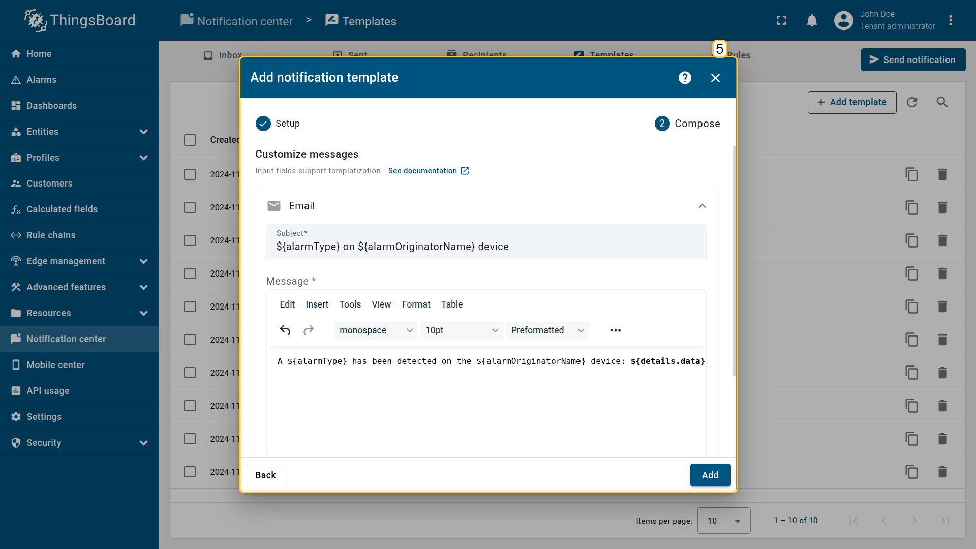 • ${details.data} – alarm details populated by the alarm rule. - Click Add to save the template.