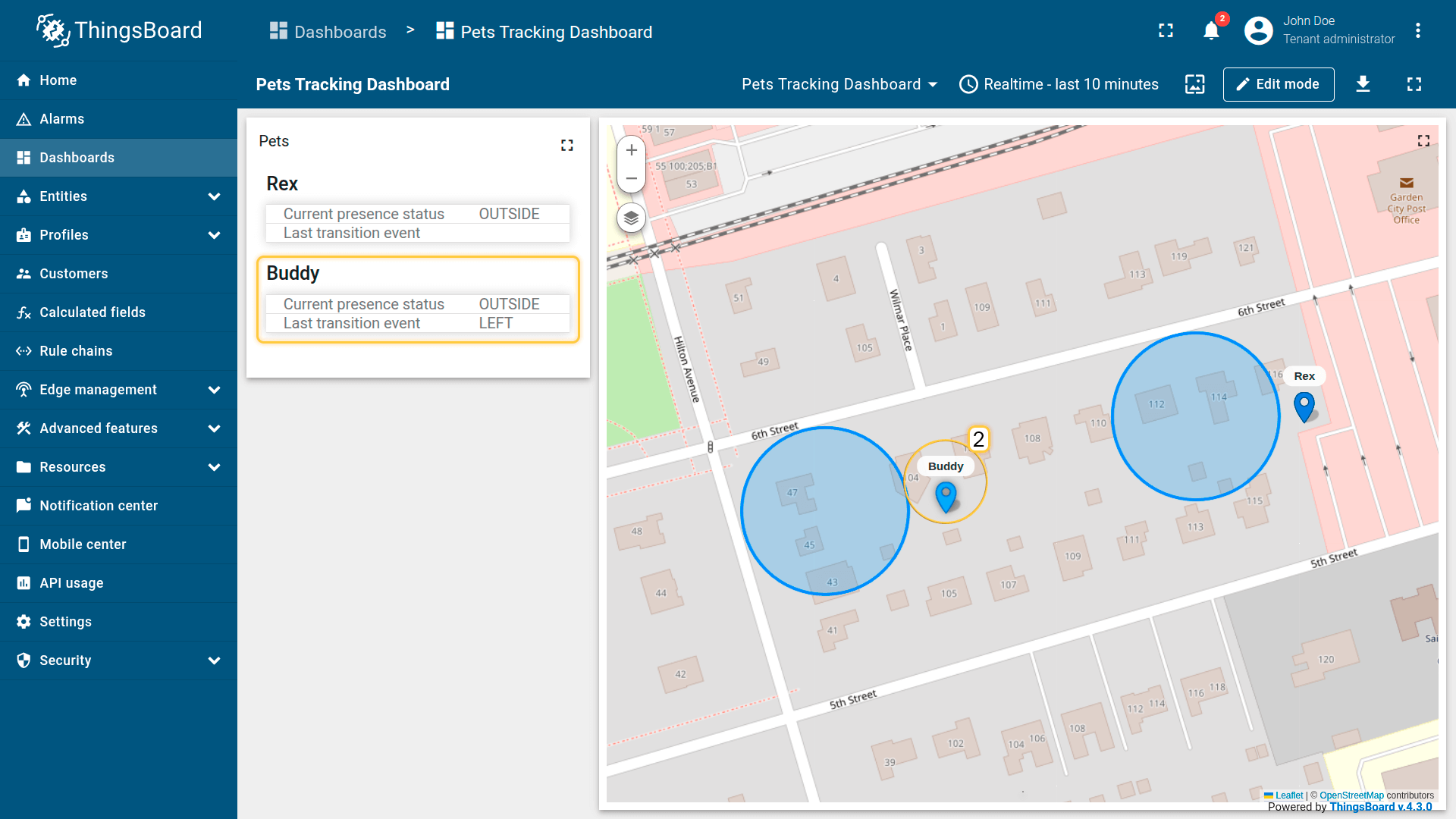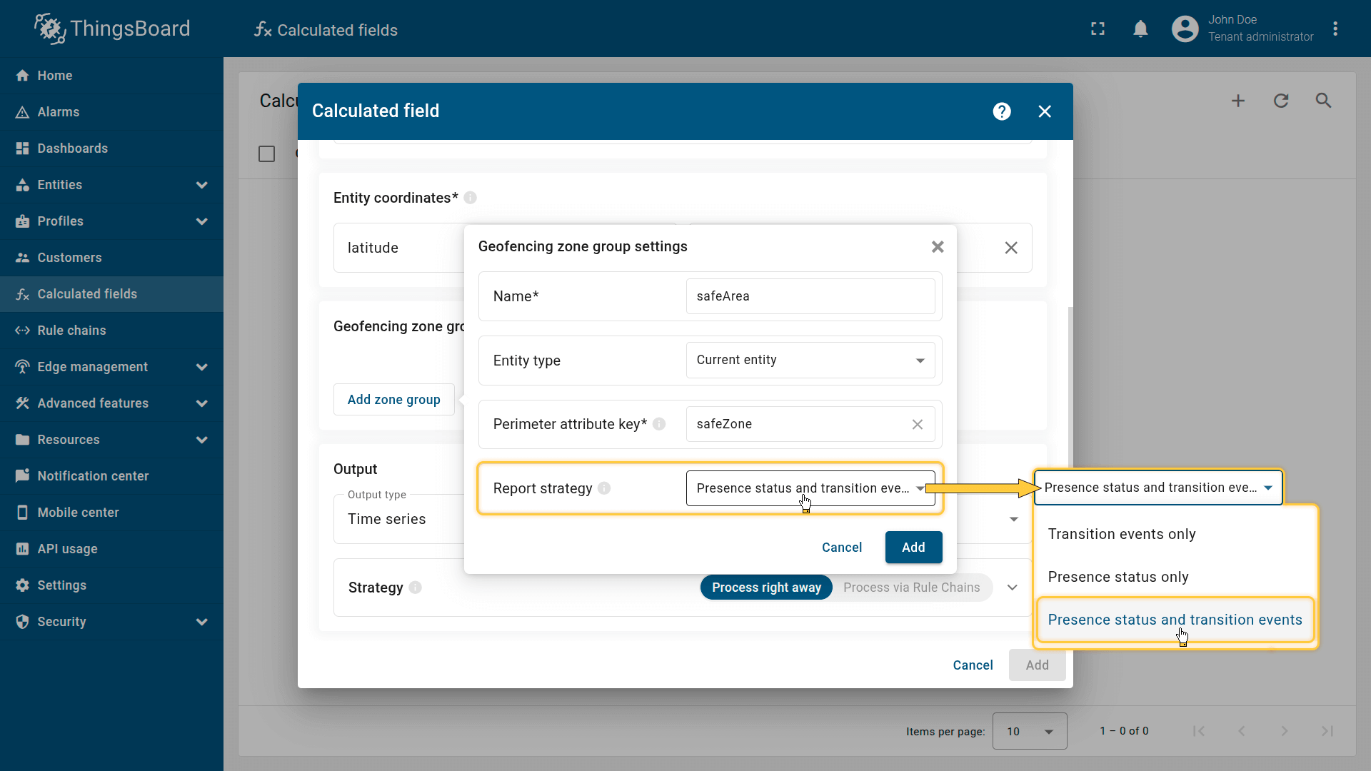 How it works: The calculated field retrieves the perimeter attribute from the Tenant or Customer that owns the entity. The device effectively inherits a zone defined at the business level.