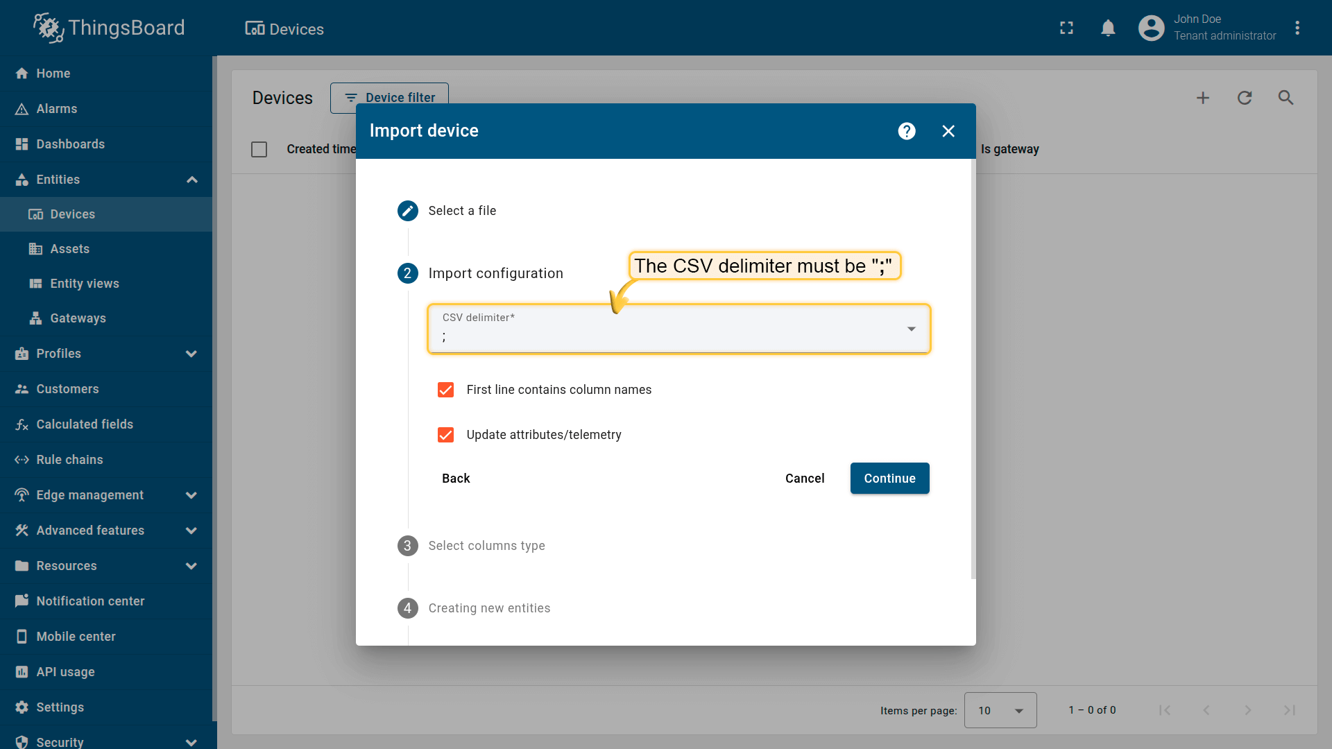 - Go to the Devices page and import the CSV file.