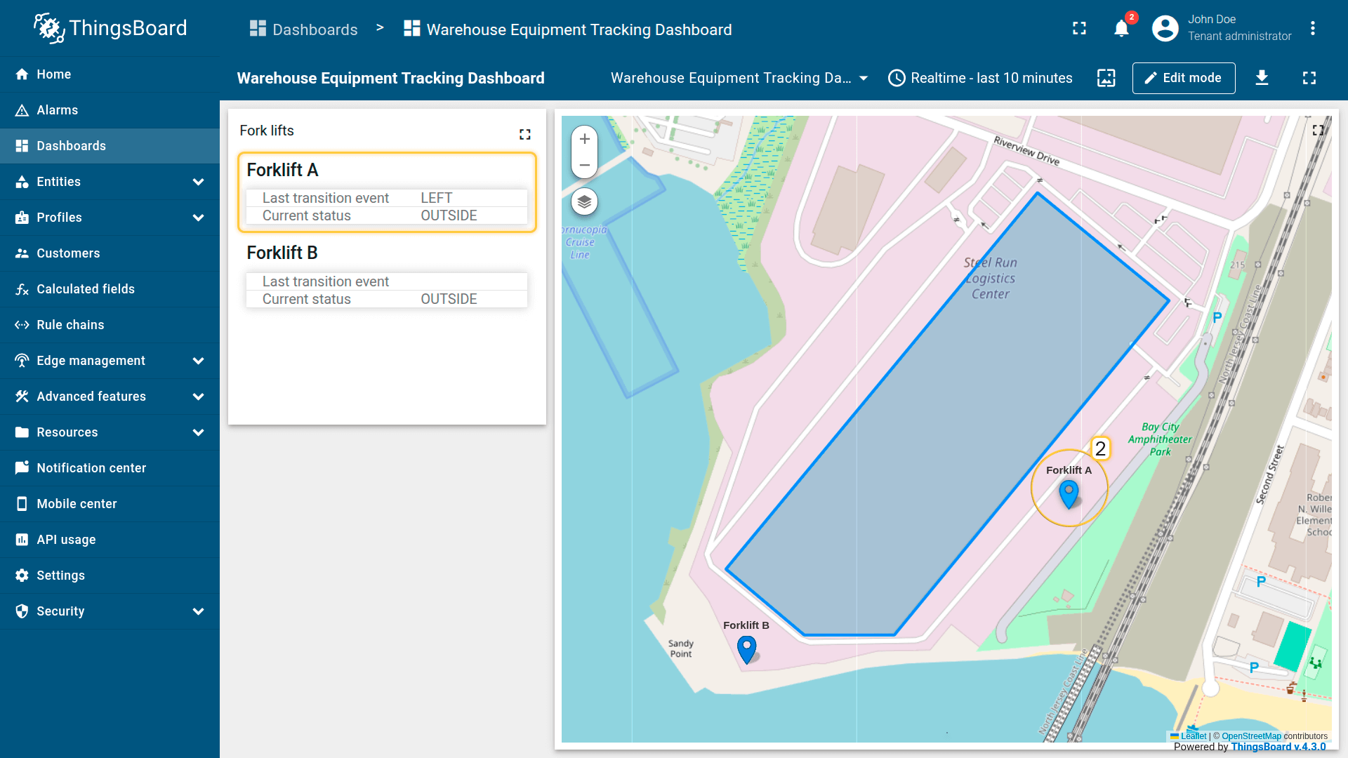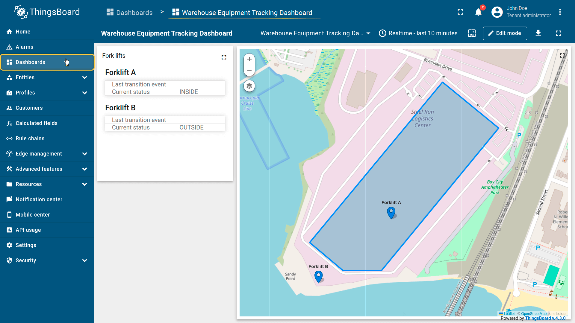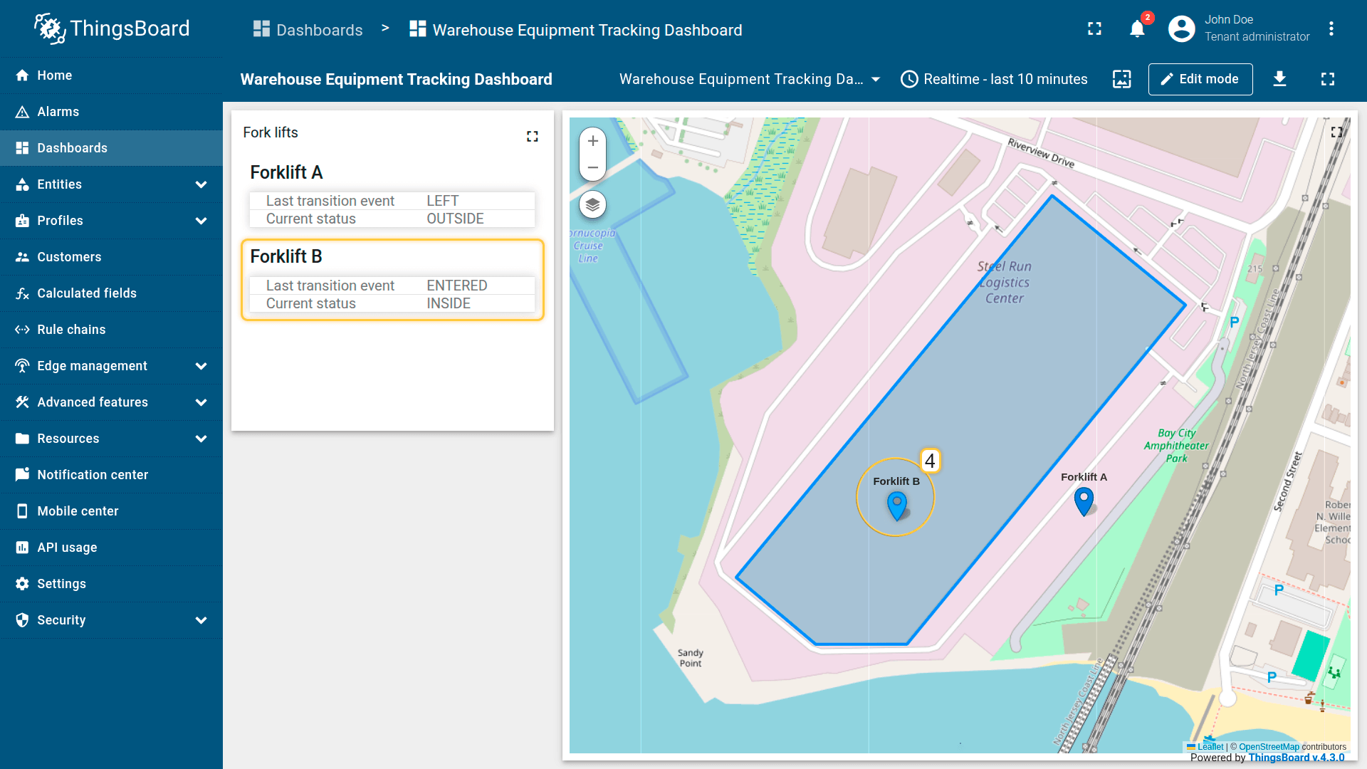 The warehouse asset publishes the geofence perimeter as an attribute.
