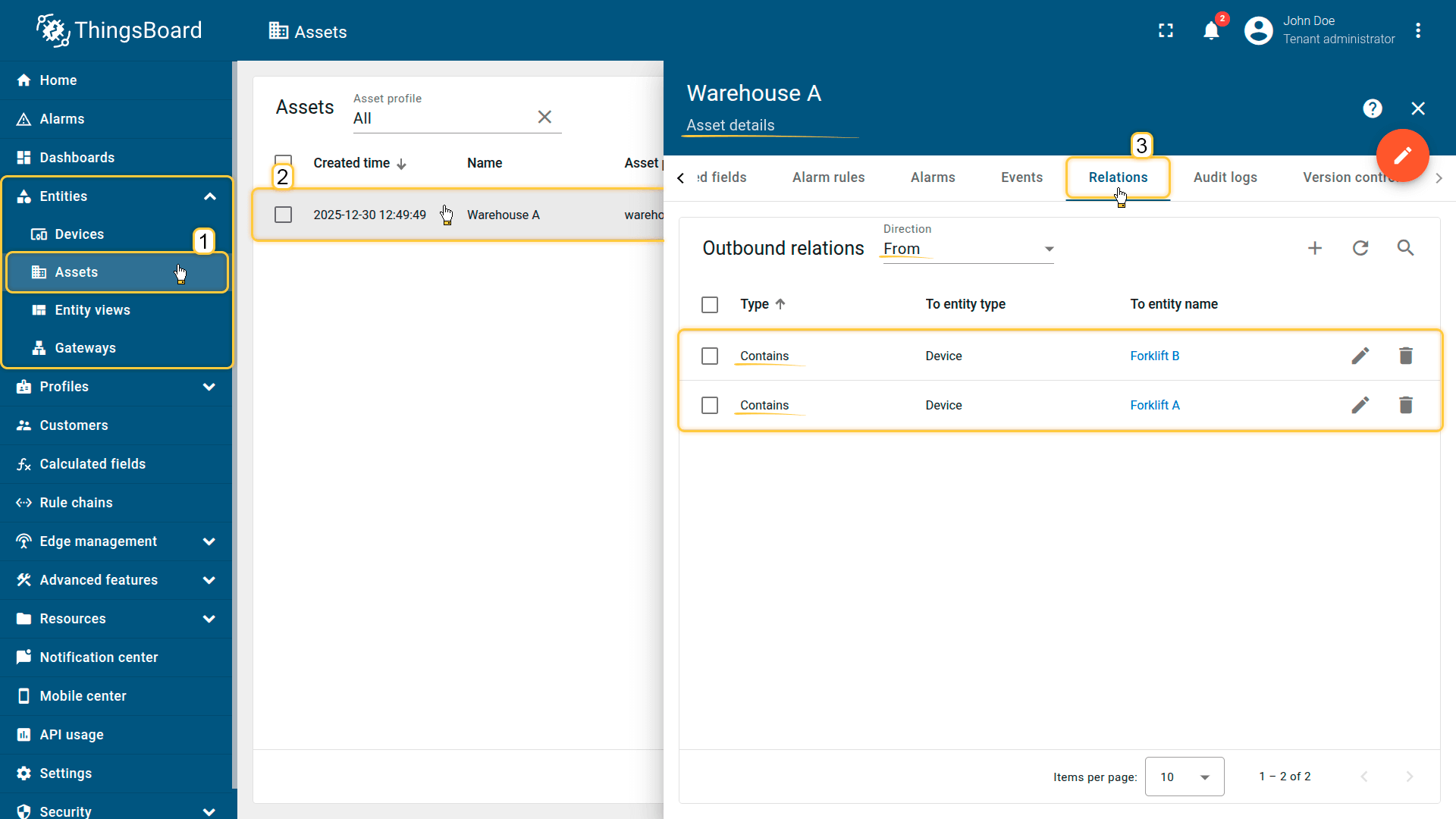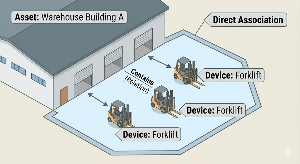 Create a relationship between the Warehouse Building A asset and the Forklift A and Forklift B devices: