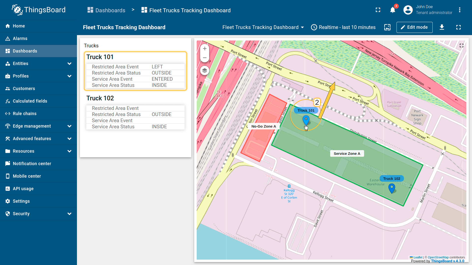 - Restricted area — detect if the truck ENTERED/LEFT any no-go zone.