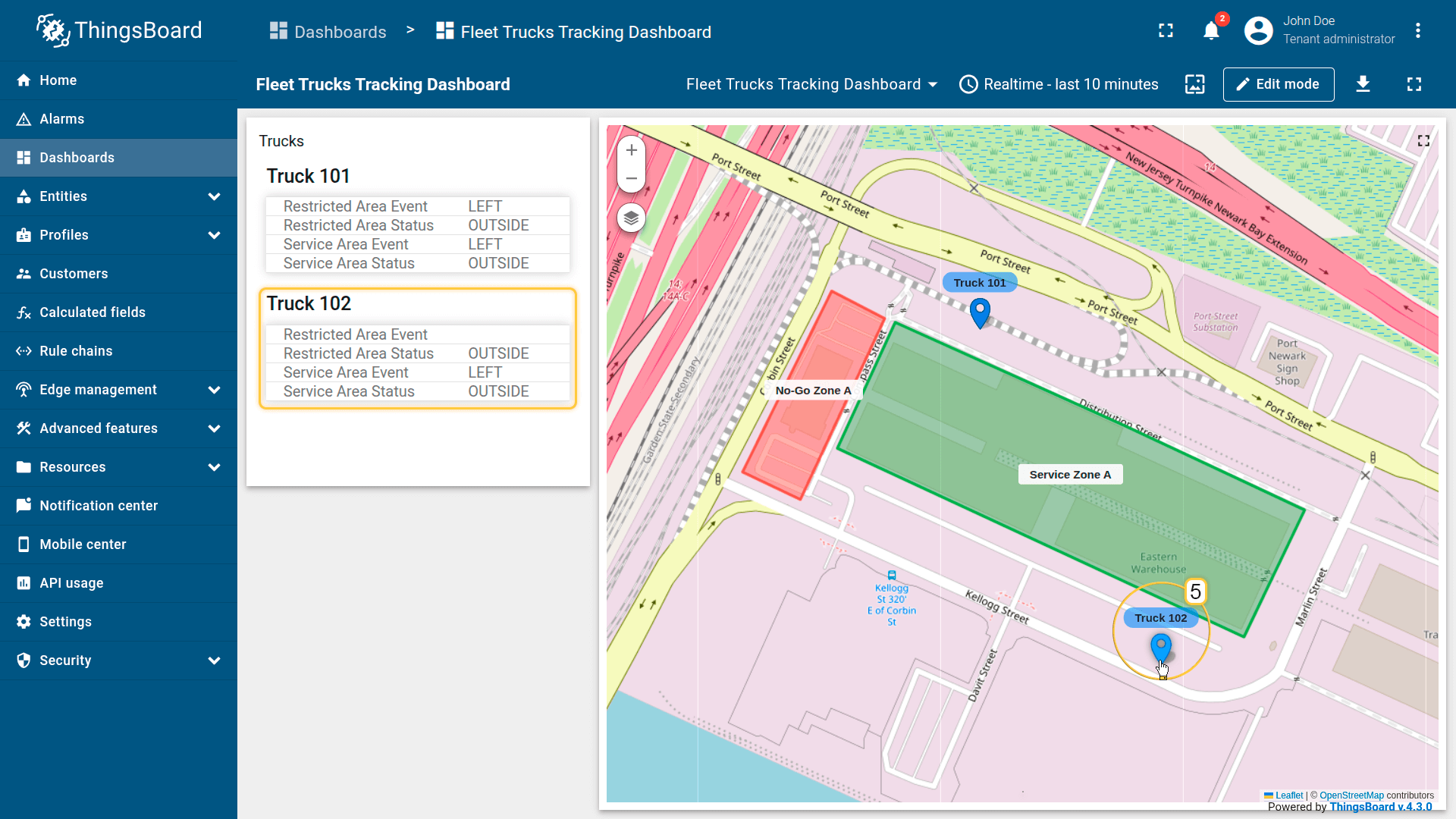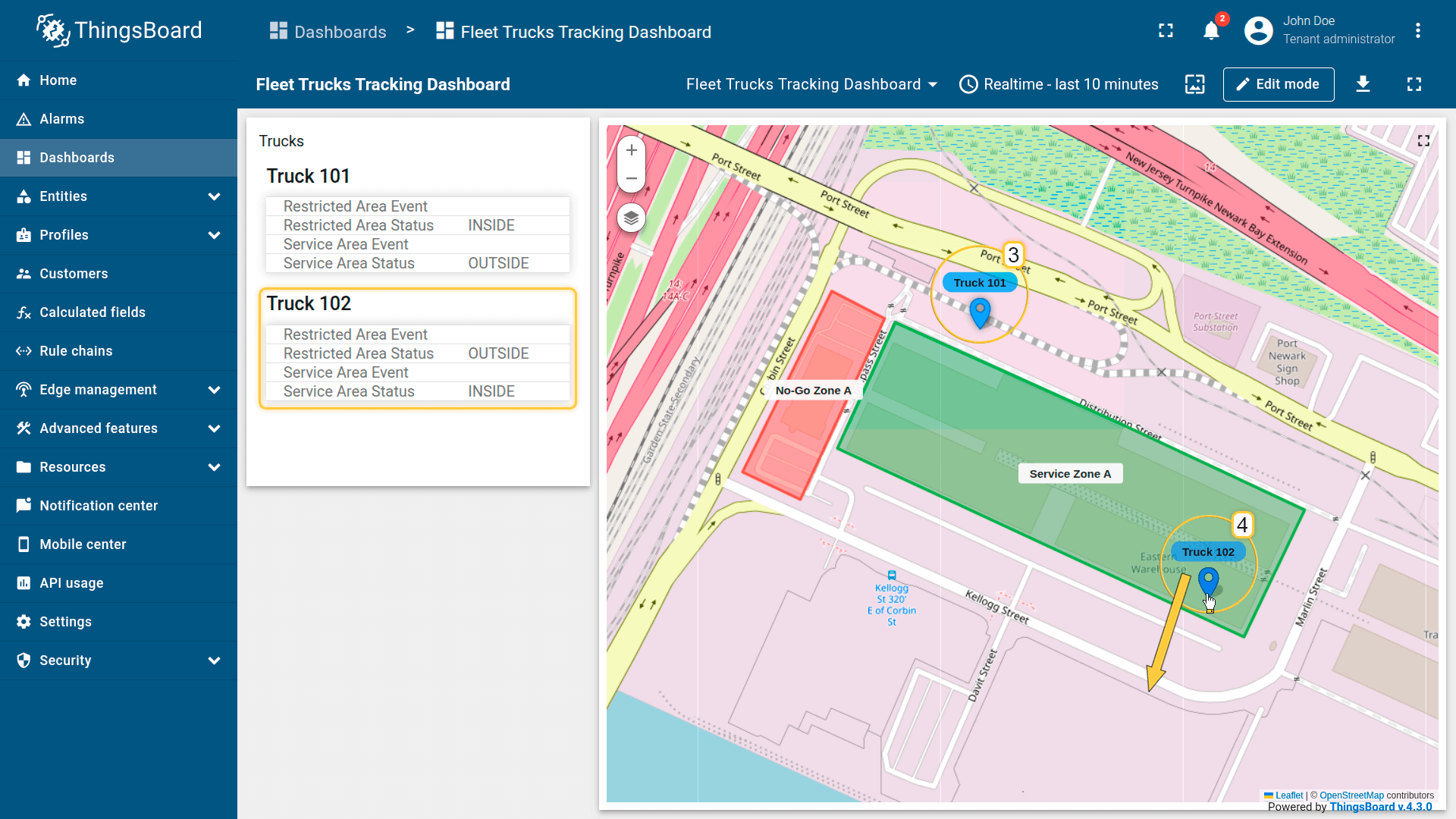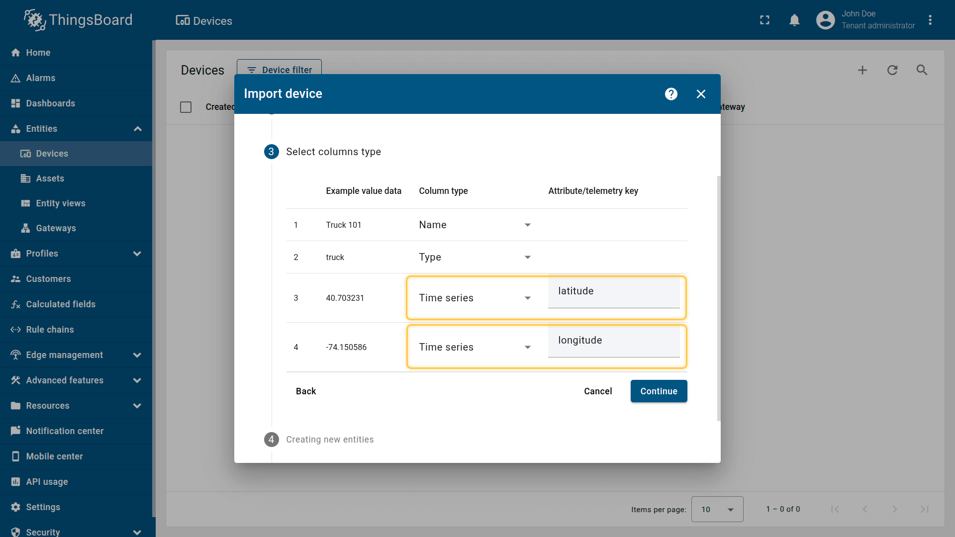 Import two devices — each represents a tracker installed in a truck. Devices publish GPS coordinates as telemetry.