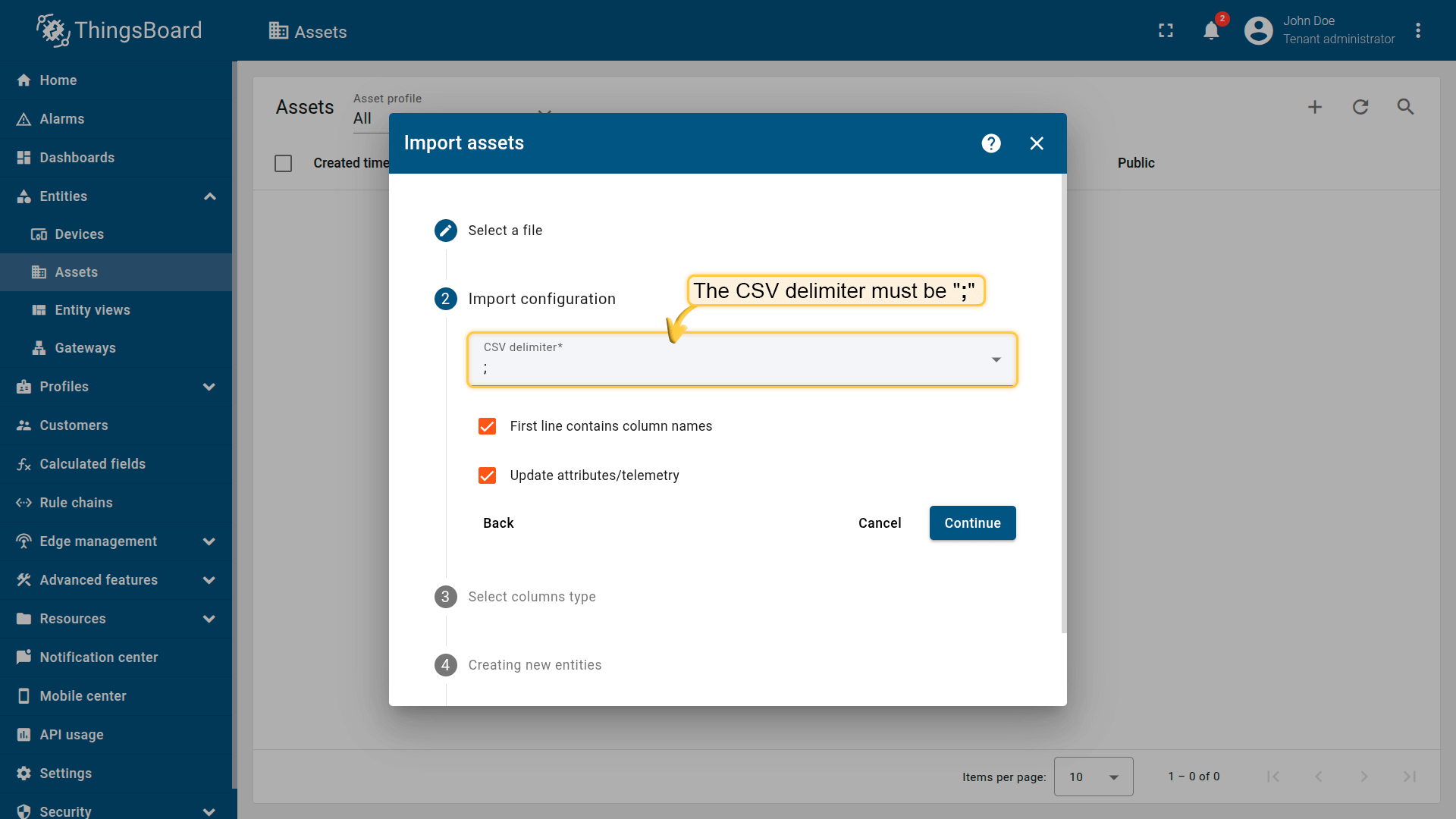 - Go to the “Assets” page and import the CSV file into your ThingsBoard instance: