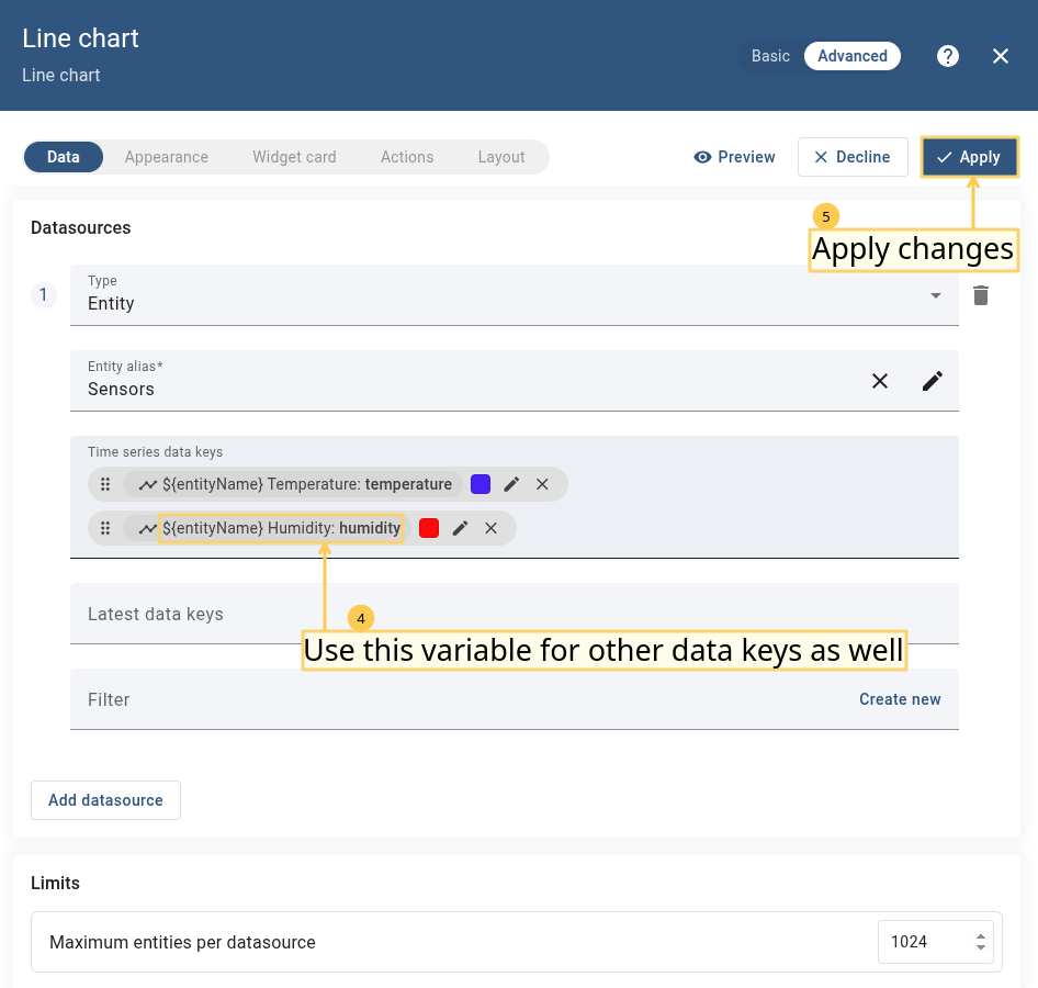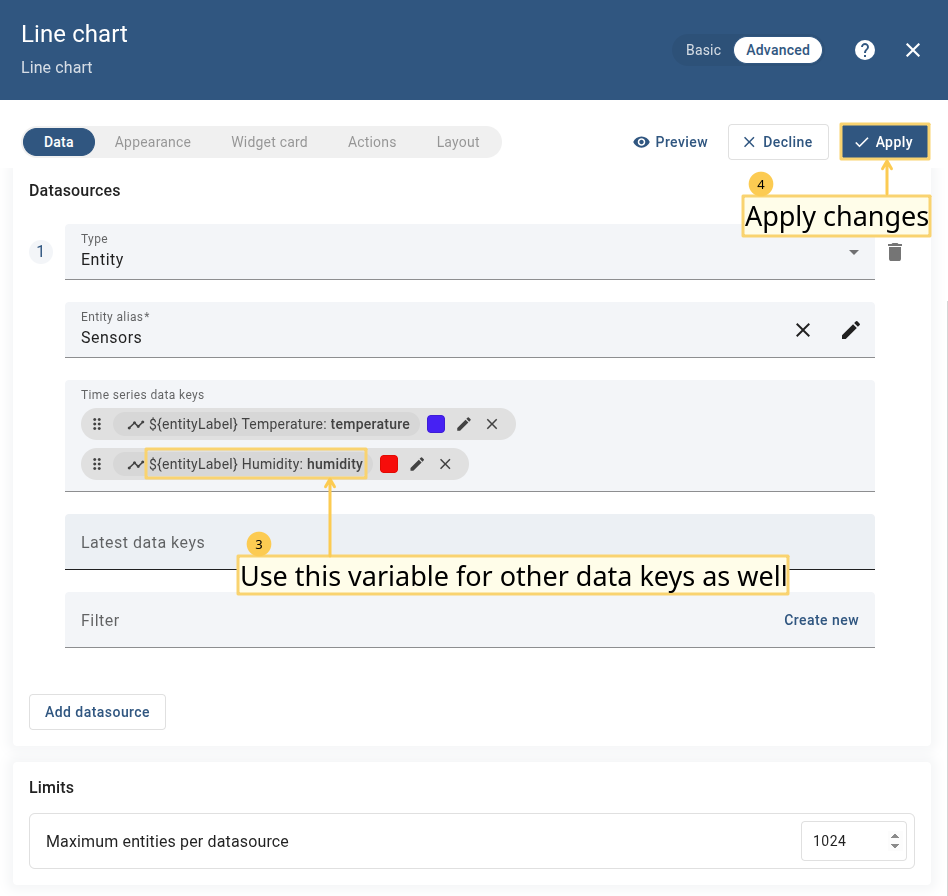 - Enter widget edit mode, specify the data source, add the required data key(s), and apply changes.