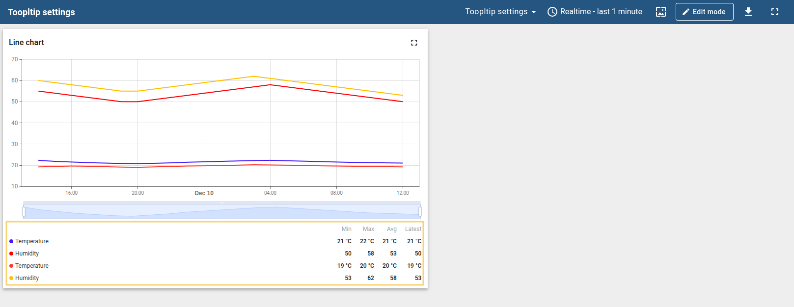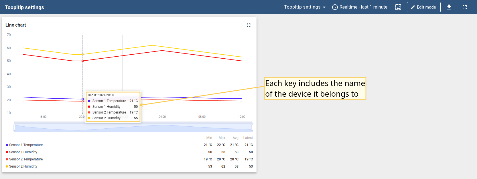 You can customize the values that will be displayed in the tooltip via tooltip settings or Advanced Data key configuration. Tooltip configuration via Settings is basic and applied to all entities at the same time. When configured in the Advanced Data key configuration, it is applied only to the specific time series data, and the basic tooltip function will be overwritten by this configuration.